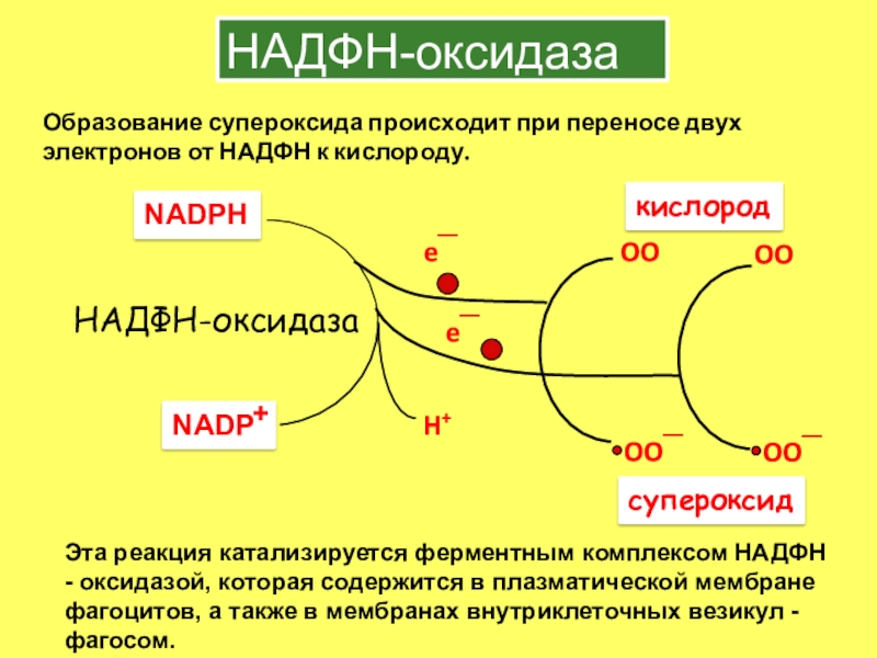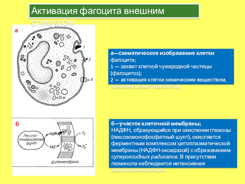 НАДФН, образующийся при окислении глюкозы (гексозомонофосфатный шунт), окисляется ферментным комплексом цитоплазматической мембраны (НАДФН-оксидазой) с образованием супероксидных радикалов. В присутствии люминола наблюдается интенсивная хемилюминесценция.