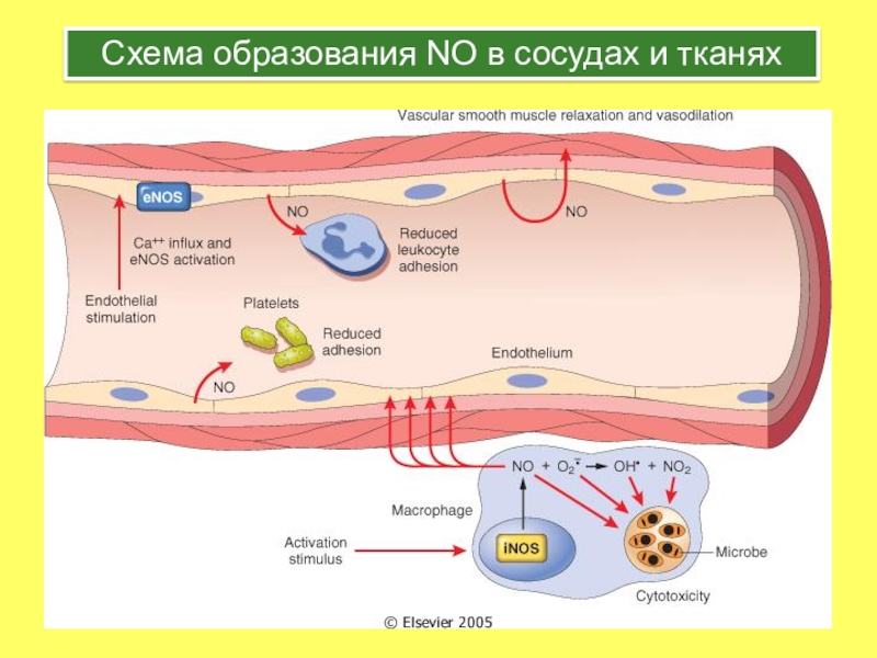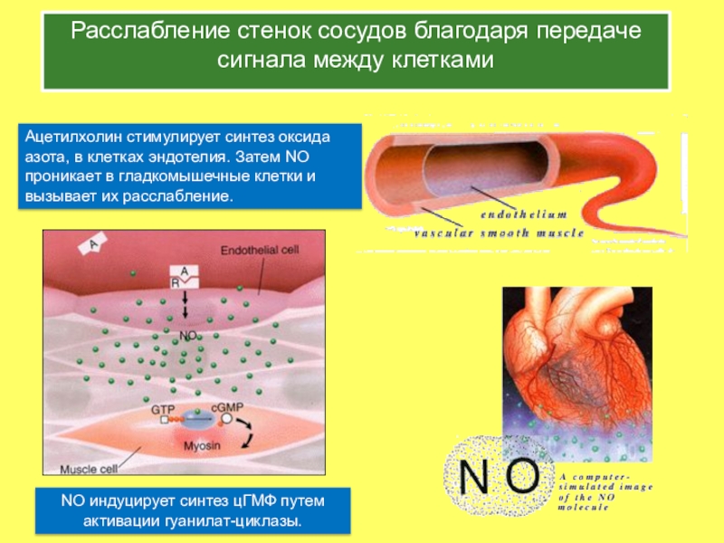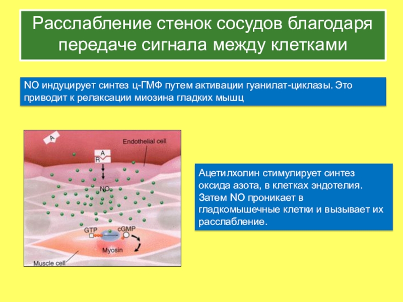 Ацетилхолин стимулирует синтез оксида азота, в клетках эндотелия. Затем NO проникает в гладкомышечные клетки и вызывает их расслабление.