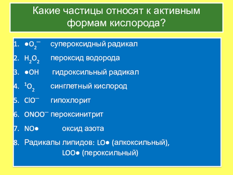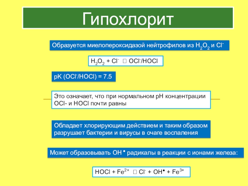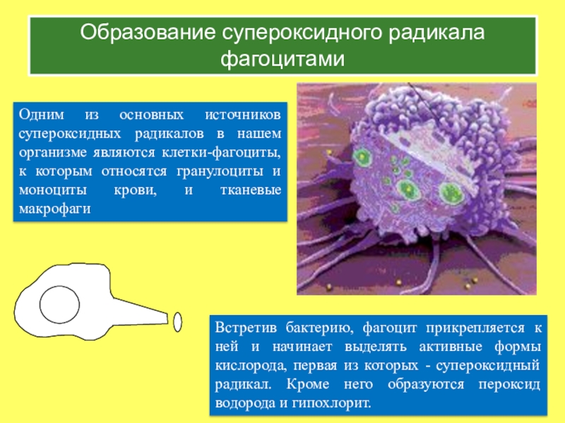 Встретив бактерию, фагоцит прикрепляется к ней и начинает выделять активные формы кислорода, первая из которых - супероксидный радикал. Кроме него образуются пероксид водорода и гипохлорит.