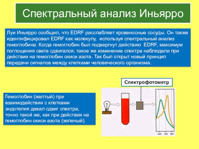 Гемоглобин (желтый) при взаимодействии с клетками эндотелия давал сдвиг спектра, точно такой же, как при действии на гемоглобин окиси азота (зеленый).