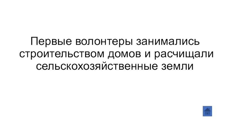 Слайд 18Первые волонтеры занимались строительством домов и расчищали сельскохозяйственные земли