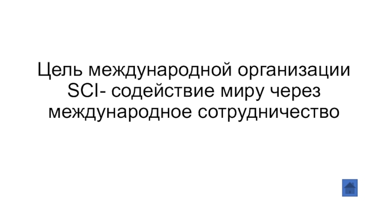 Слайд 30Цель международной организации SCI- содействие миру через международное сотрудничество