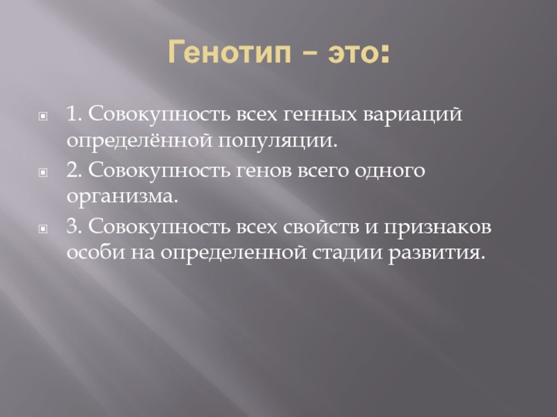 Генотип – это:1. Совокупность всех генных вариаций определённой популяции.2. Совокупность генов всего одного организма.3. Совокупность всех свойств