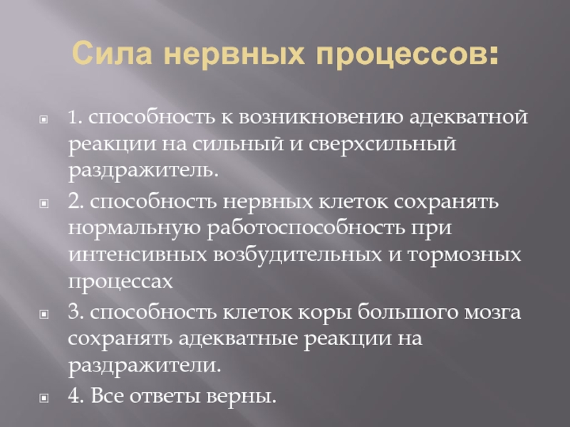 Сила нервных процессов:1. способность к возникновению адекватной реакции на сильный и сверхсильный раздражитель. 2. способность нервных клеток