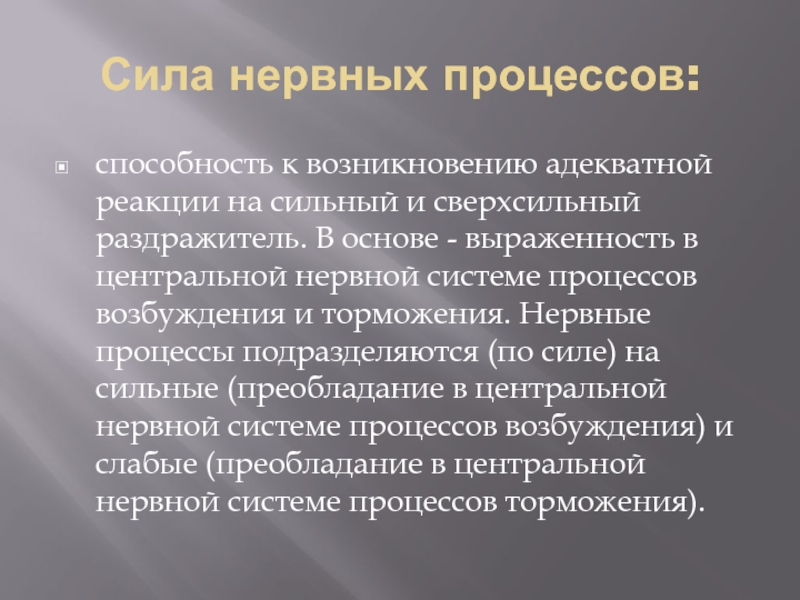 Сила нервных процессов:способность к возникновению адекватной реакции на сильный и сверхсильный раздражитель. В основе - выраженность в