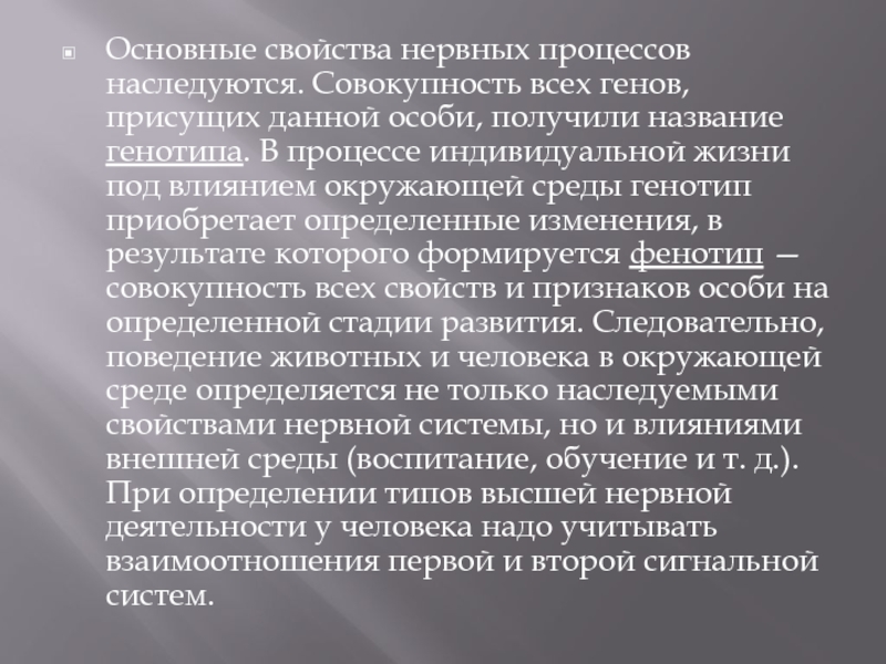Основные свойства нервных процессов наследуются. Совокупность всех генов, присущих данной особи, получили название генотипа. В процессе индивидуальной