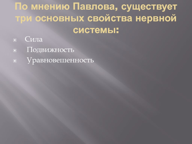 По мнению Павлова, существует три основных свойства нервной системы: Сила Подвижность  Уравновешенность