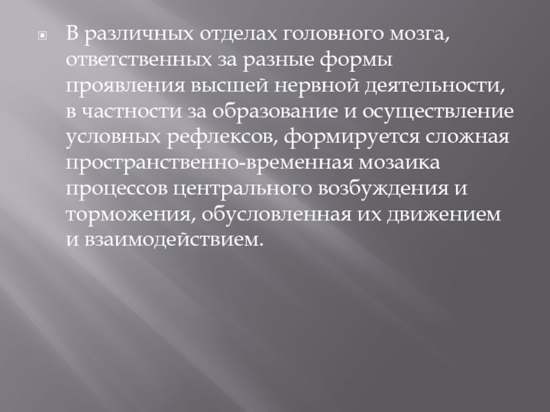 рефлексов, формируется сложная пространственно-временная мозаика процессов центрального возбуждения и торможения, обусловленная их движением и взаимодействием.