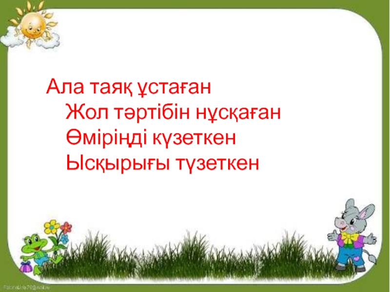 Ала таяқ ұстаған     Жол тәртібін нұсқаған     Өміріңді күзеткен