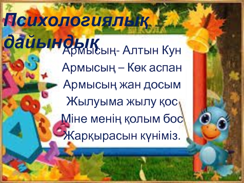 Психологиялық дайындықАрмысың- Алтын КунАрмысың – Көк аспанАрмысың жан досымЖылуыма жылу қосМіне менің қолым босЖарқырасын күніміз.