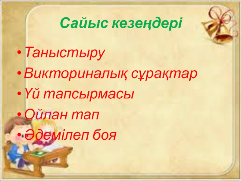 Сайыс кезеңдеріТаныстыруВикториналық сұрақтарҮй тапсырмасыОйлан тапӘдемілеп боя