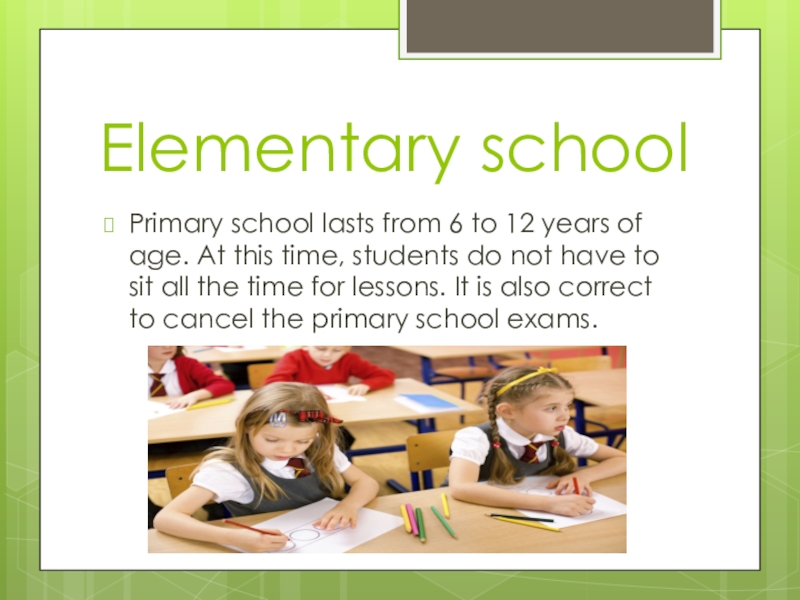 Elementary schoolPrimary school lasts from 6 to 12 years of age. At this time, students do not