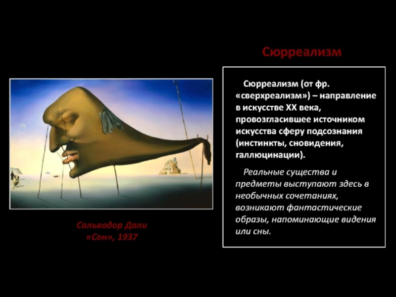Сюрреалисты стремятся освободить Я, подавленное реальностью. Такое искусство призвано дать человеку возможность овладеть своей внутренней сущностью, о которой он ничего не знает. Тот же «папа» сюрреализма Бретон говорил, что от гнетущей реальности некуда бежать, кроме как в детство, сон и фантазии. Стоит также отметить,что сферой деятельности сюрреалистов было не только искусство, они хотели изменить жизнь.