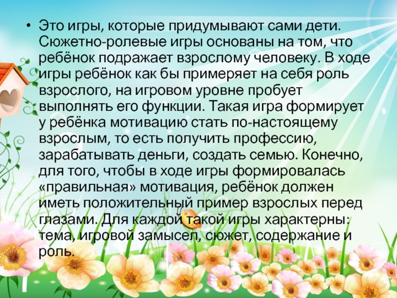 Слайд 3Это игры, которые придумывают сами дети. Сюжетно-ролевые игры основаны на