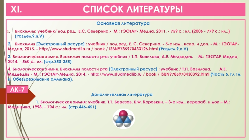 4. Биологическая химия. Биохимия полости рта [Электронный ресурс] : учебник / Т.П. Вавилова, А.Е.Медведев - М. : ГЭОТАР-Медиа, 2014. - http://www.studmedlib.ru / book / ISBN9785970430392.html (Часть 5, Гл.16, п. Обезвреживание аммиака).