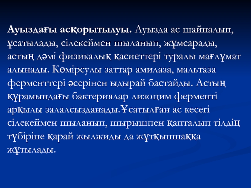 Ауыздағы асқорытылуы. Ауызда ас шайналып, ұсатылады, сілекеймен шыланып, жұмсарады, астың