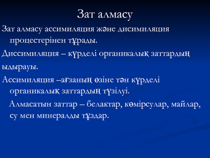 Зат алмасу ассимиляция және дисимиляция процестерінен тұрады.