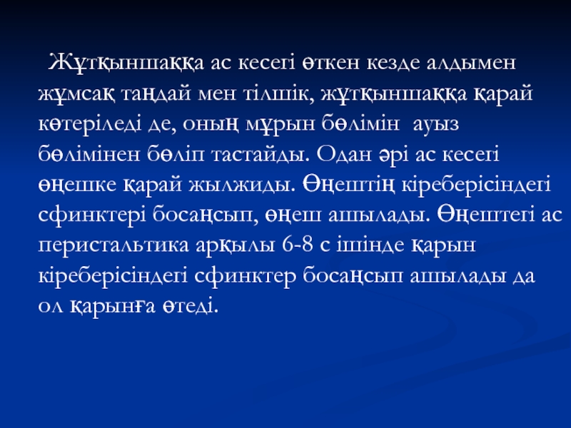 де, оның мұрын бөлімін ауыз бөлімінен бөліп тастайды. Одан әрі ас кесегі өңешке қарай жылжиды. Өңештің кіреберісіндегі сфинктері босаңсып, өңеш ашылады. Өңештегі ас перистальтика арқылы 6-8 с ішінде қарын кіреберісіндегі сфинктер босаңсып ашылады да ол қарынға өтеді.