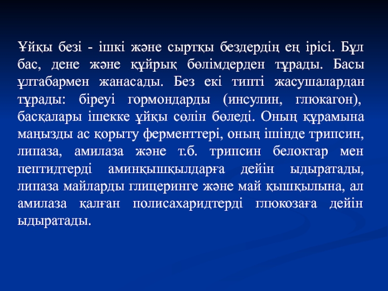 Слайд 18Ұйқы безі - ішкі және сыртқы бездердің ең ірісі. Бұл