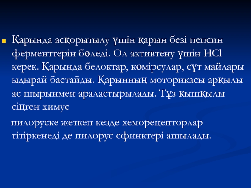 үшін HCl керек. Қарында белоктар, көмірсулар, сүт майлары ыдырай бастайды.