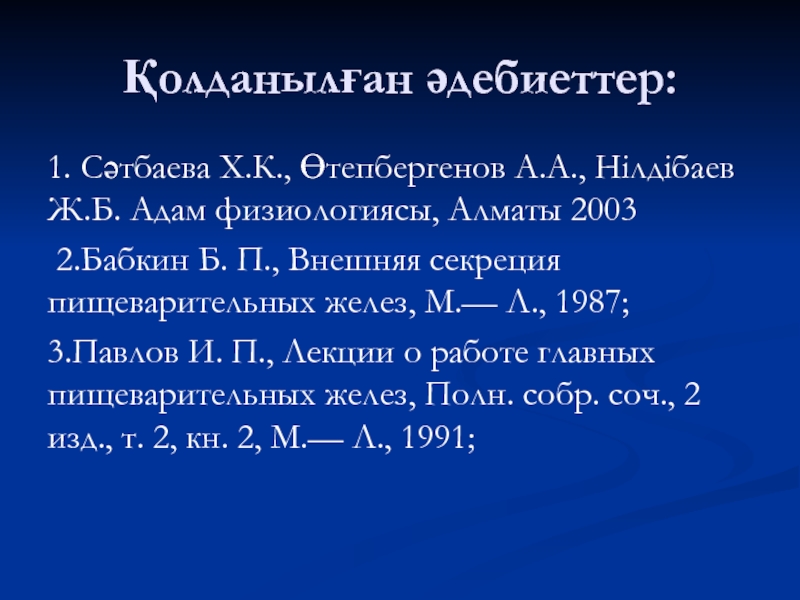 1. Сәтбаева Х.К., Өтепбергенов А.А., Нілдібаев Ж.Б. Адам физиологиясы,