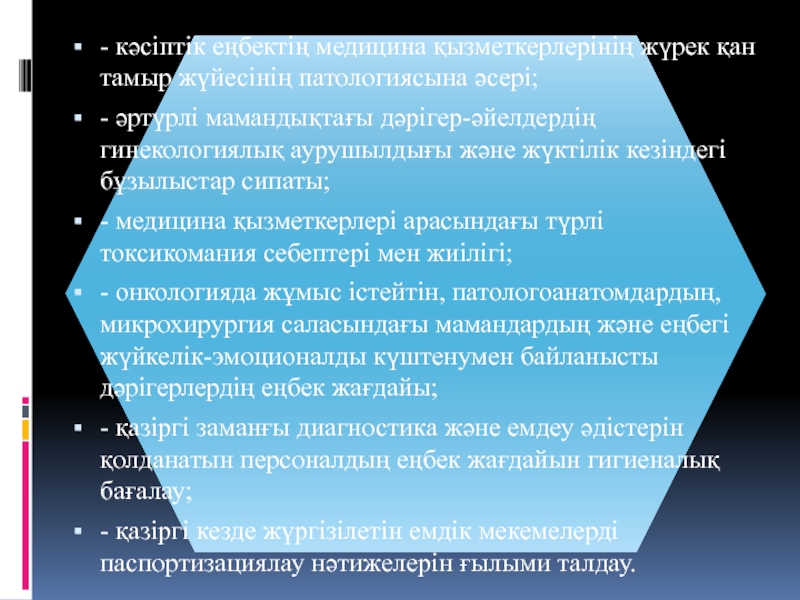 Слайд 7- кәсіптік еңбектің медицина қызметкерлерінің жүрек қан тамыр жүйесінің патологиясына