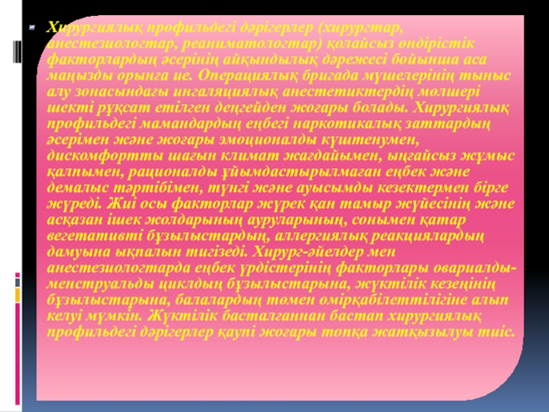 Слайд 8Хирургиялық профильдегі дәрігерлер (хирургтар, анестезиологтар, реаниматологтар) қолайсыз өндірістік факторлардың әсерінің