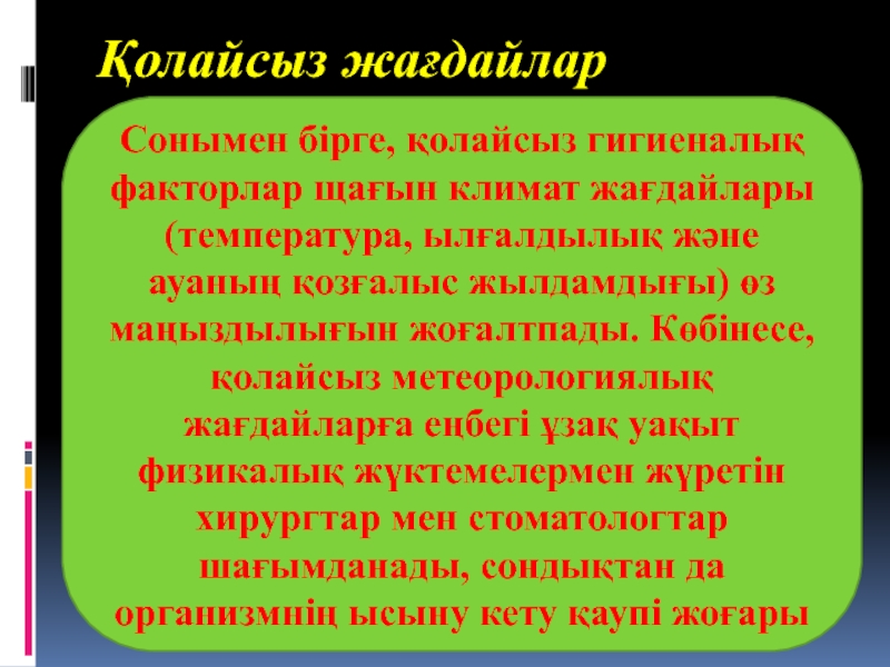 Слайд 5Сонымен бірге, қолайсыз гигиеналық факторлар щағын климат жағдайлары (температура, ылғалдылық