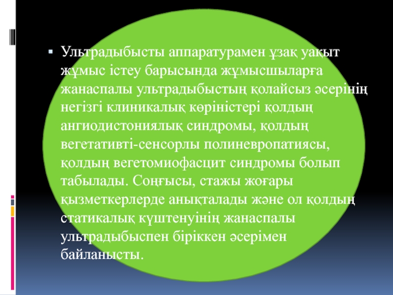 Слайд 11Ультрадыбысты аппаратурамен ұзақ уақыт жұмыс істеу барысында жұмысшыларға жанаспалы ультрадыбыстың