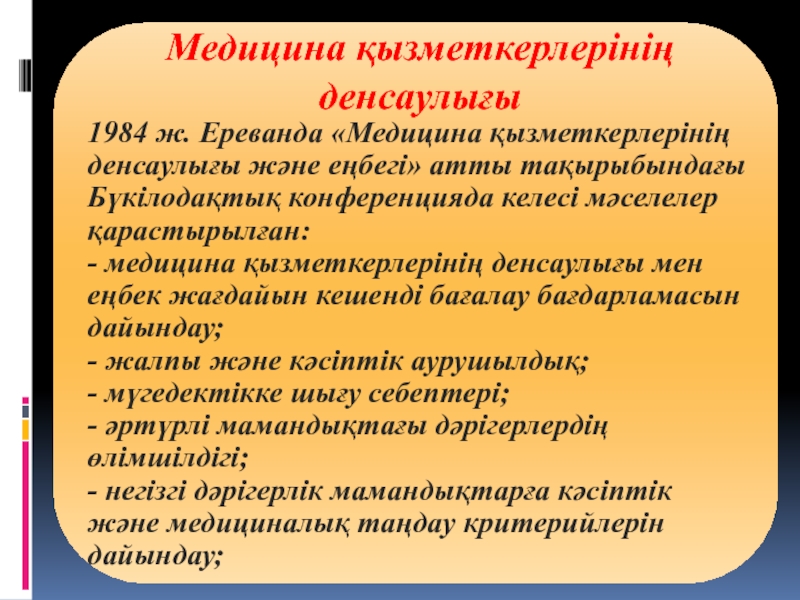 Слайд 6Медицина қызметкерлерінің денсаулығы