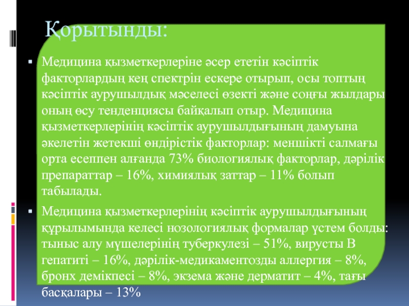 Медицина қызметкерлерінің кәсіптік аурушылдығының құрылымында келесі нозологиялық формалар үстем болды: тыныс алу мүшелерінің туберкулезі – 51%, вирусты В гепатиті – 16%, дәрілік-медикаментозды аллергия – 8%, бронх демікпесі – 8%, экзема және дерматит – 4%, тағы басқалары – 13%