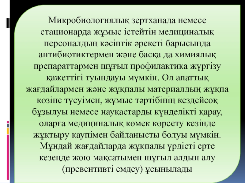 Слайд 10Микробиологиялық зертханада немесе стационарда жұмыс істейтін медициналық персоналдың кәсіптік әрекеті