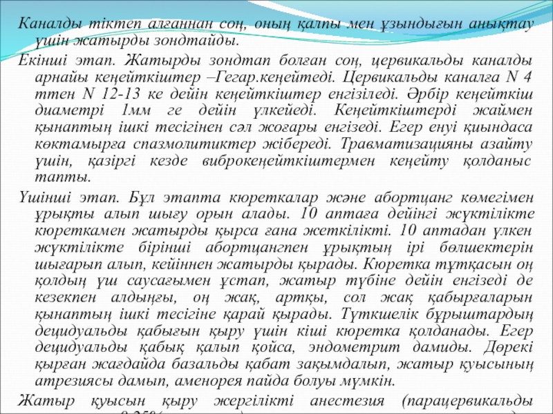 Екінші этап. Жатырды зондтап болған соң, цервикальды каналды арнайы