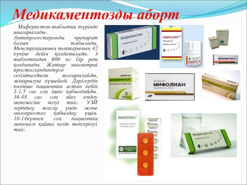 мг бір рет қолданады. Жатыр миометриі простогландиндерге сезімталдығы жоғарылайды, жиырылуы күшейеді. Дәрігердің көзінше пациентка астан кейін 1-1.5 сағ соң ішке қабылдайды. 36-48 сағ соң әйел емдеу мекемесіне келуі тиіс. УЗИ зерттеу жасау үшін және мизопростол қабылдау үшін. 10-14күннен соң пациентка мекемеге қайта келіп тексерілуі тиіс.