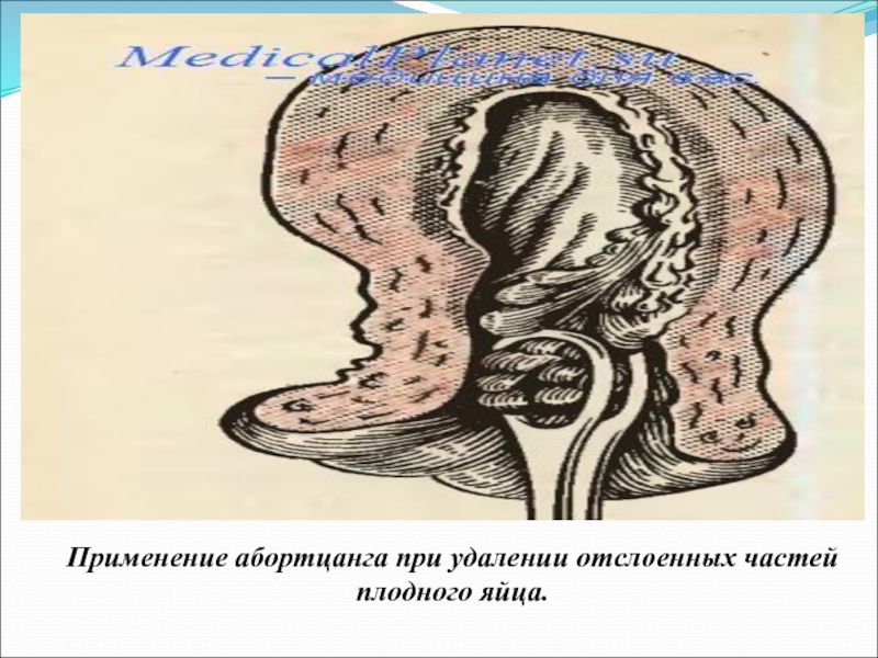 Слайд 11Применение абортцанга при удалении отслоенных частей плодного яйца.