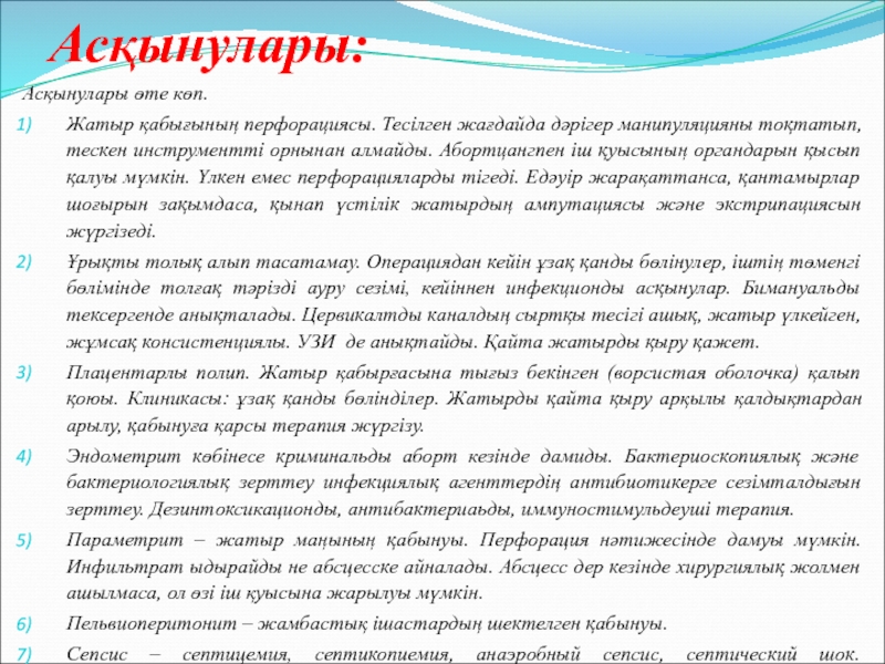 Плацентарлы полип. Жатыр қабырғасына тығыз бекінген (ворсистая оболочка) қалып қоюы. Клиникасы: ұзақ қанды бөлінділер. Жатырды қайта қыру арқылы қалдықтардан арылу, қабынуға қарсы терапия жүргізу.