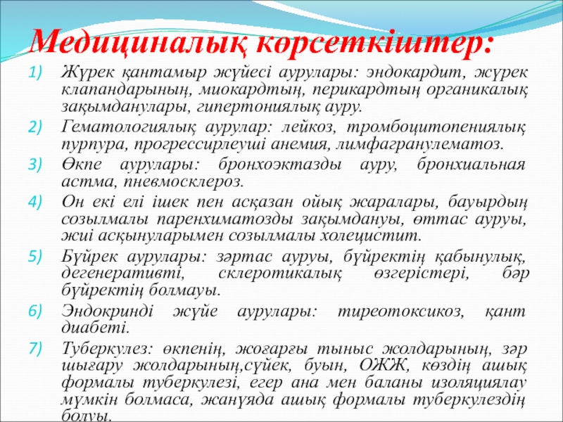 Туберкулез: өкпенің, жоғарғы тыныс жолдарының, зәр шығару жолдарының,сүйек, буын, ОЖЖ, көздің ашық формалы туберкулезі, егер ана мен баланы изоляциялау мүмкін болмаса, жанүяда ашық формалы туберкулездің болуы.