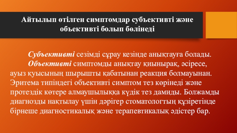 Слайд 11 Субъективті сезімді сұрау кезінде анықтауға болады. Объективті симптомды анықтау қиынырақ,