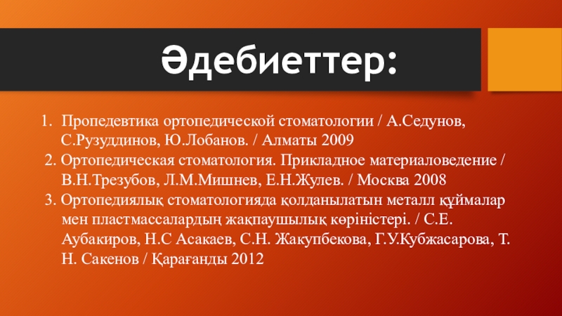 3. Ортопедиялық стоматологияда қолданылатын металл құймалар мен пластмассалардың жақпаушылық көріністері. / С.Е.Аубакиров, Н.С Асакаев, С.Н. Жакупбекова, Г.У.Кубжасарова, Т.Н. Сакенов / Қарағанды 2012