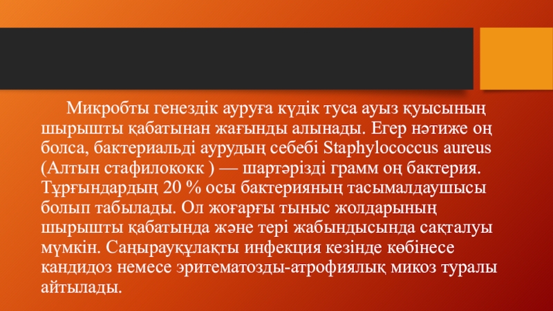 Слайд 14 Микробты генездік ауруға күдік туса ауыз қуысының шырышты қабатынан