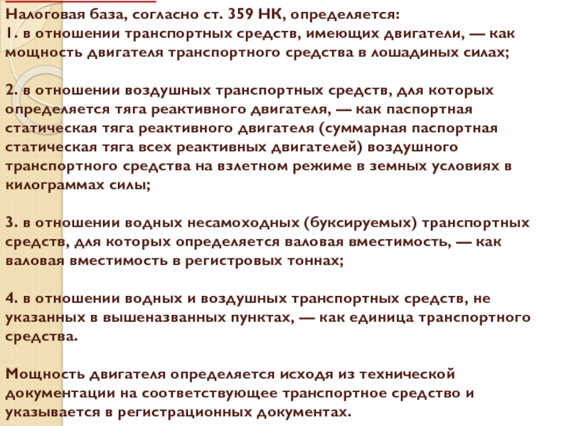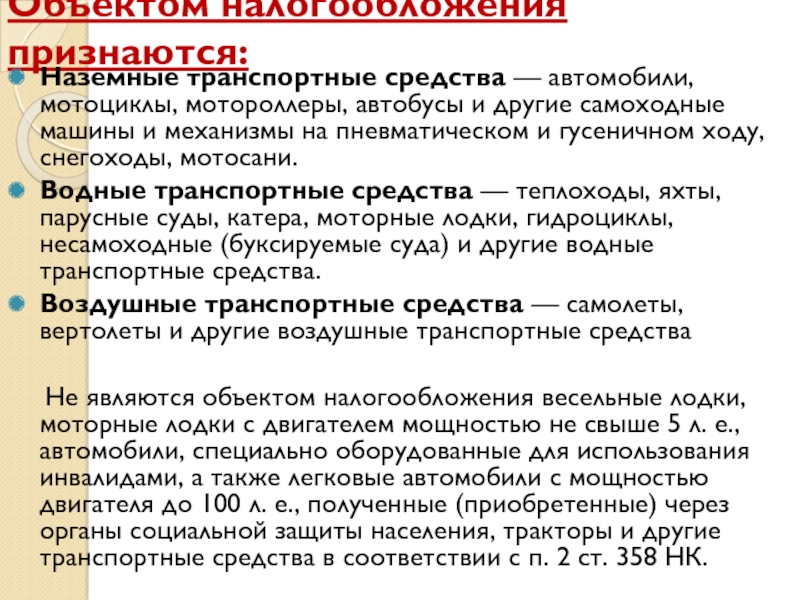 Не являются объектом налогообложения весельные лодки, моторные лодки с двигателем мощностью не свыше 5 л. е., автомобили, специально оборудованные для использования инвалидами, а также легковые автомобили с мощностью двигателя до 100 л. е., полученные (приобретенные) через органы социальной защиты населения, тракторы и другие транспортные средства в соответствии с п. 2 ст. 358 НК.
