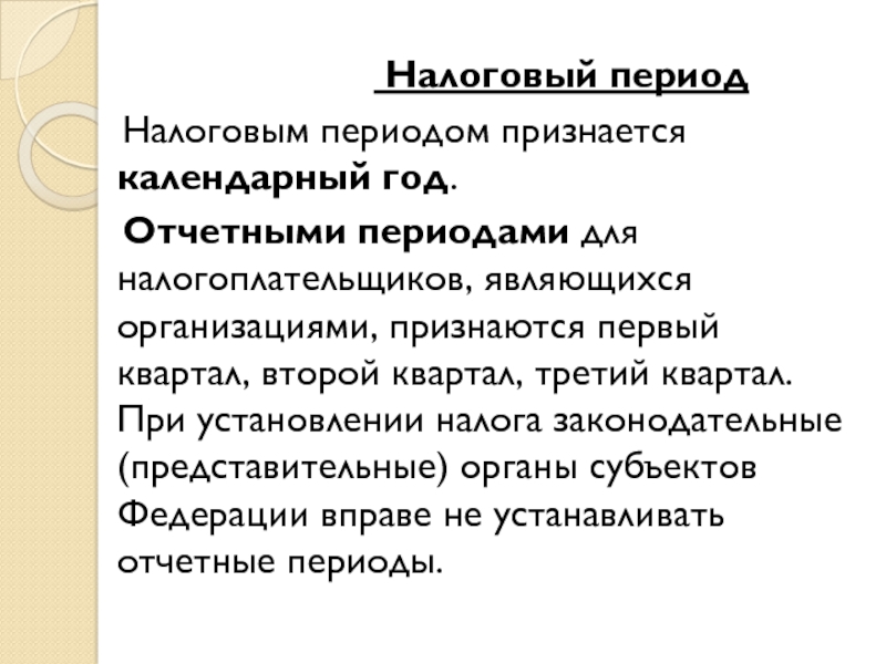 Отчетными периодами для налогоплательщиков, являющихся организациями, признаются первый квартал, второй квартал, третий квартал. При установлении налога законодательные (представительные) органы субъектов Федерации вправе не устанавливать отчетные периоды.