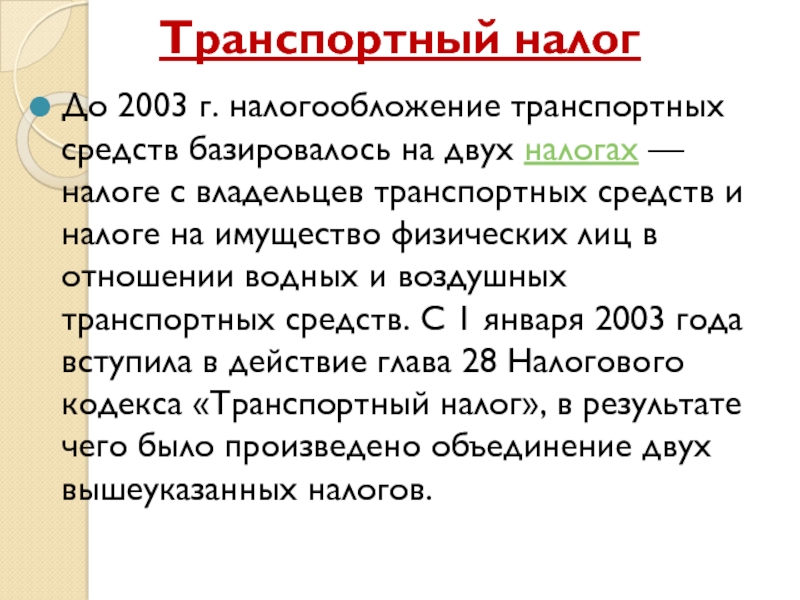До 2003 г. налогообложение транспортных средств базировалось на двух
