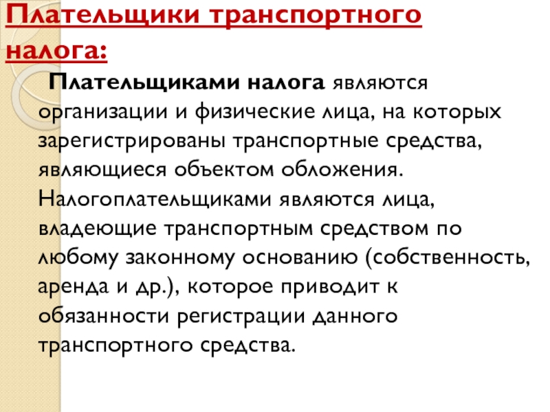 лица, на которых зарегистрированы транспортные средства, являющиеся объектом обложения. Налогоплательщиками