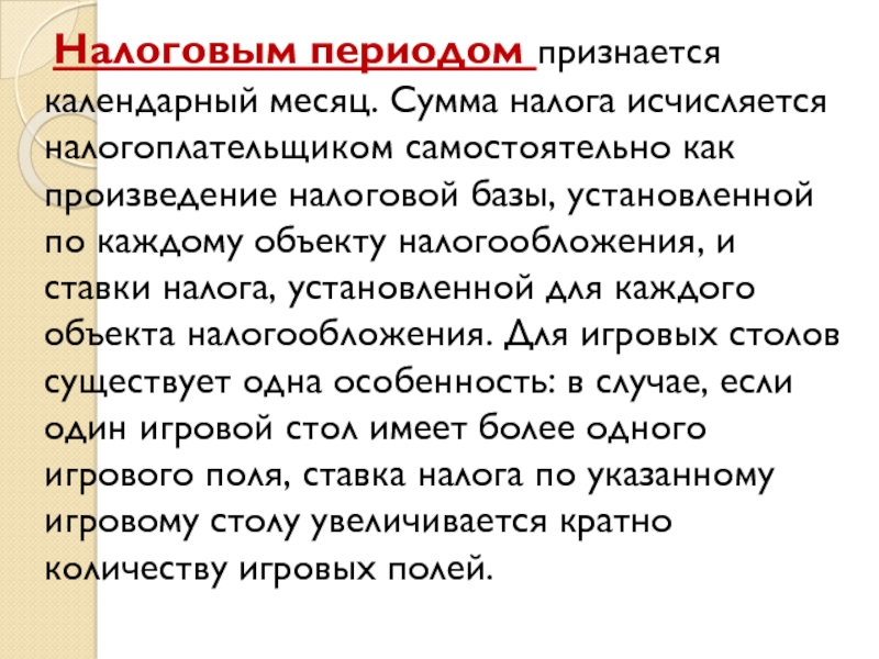 налогообложения, и ставки налога, установленной для каждого объекта налогообложения. Для игровых столов существует одна особенность: в случае, если один игровой стол имеет более одного игрового поля, ставка налога по указанному игровому столу увеличивается кратно количеству игровых полей.
