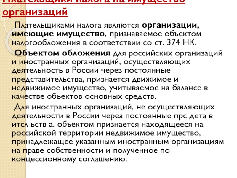 Для иностранных организаций, не осуществляющих деятельности в России через постоянные прс дета в итсл ьств а. объектом признается находящееся на российской территории недвижимое имущество, принадлежащее указанным иностранным организациям на праве собственности и полученное по концессионному соглашению.