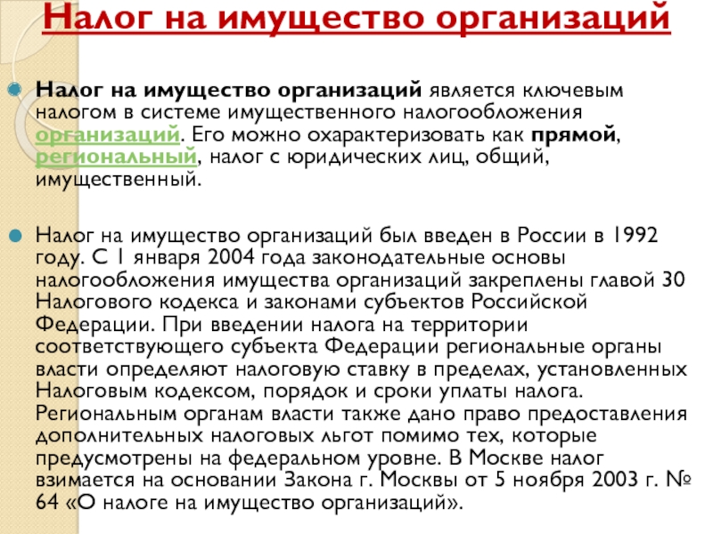 Налог на имущество организаций был введен в России в 1992 году. С 1 января 2004 года законодательные основы налогообложения имущества организаций закреплены главой 30 Налогового кодекса и законами субъектов Российской Федерации. При введении налога на территории соответствующего субъекта Федерации региональные органы власти определяют налоговую ставку в пределах, установленных Налоговым кодексом, порядок и сроки уплаты налога. Региональным органам власти также дано право предоставления дополнительных налоговых льгот помимо тех, которые предусмотрены на федеральном уровне. В Москве налог взимается на основании Закона г. Москвы от 5 ноября 2003 г. № 64 «О налоге на имущество организаций».