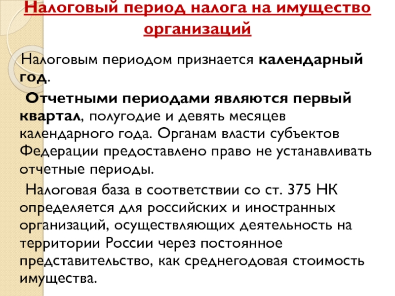 Налоговая база в соответствии со ст. 375 НК определяется для российских и иностранных организаций, осуществляющих деятельность на территории России через постоянное представительство, как среднегодовая стоимость имущества.