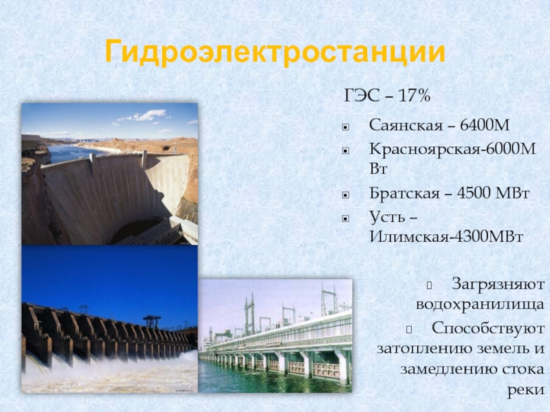 Гидроэлектростанции       ГЭС – 17%Саянская – 6400МКрасноярская-6000МВт Братская – 4500 МВтУсть –