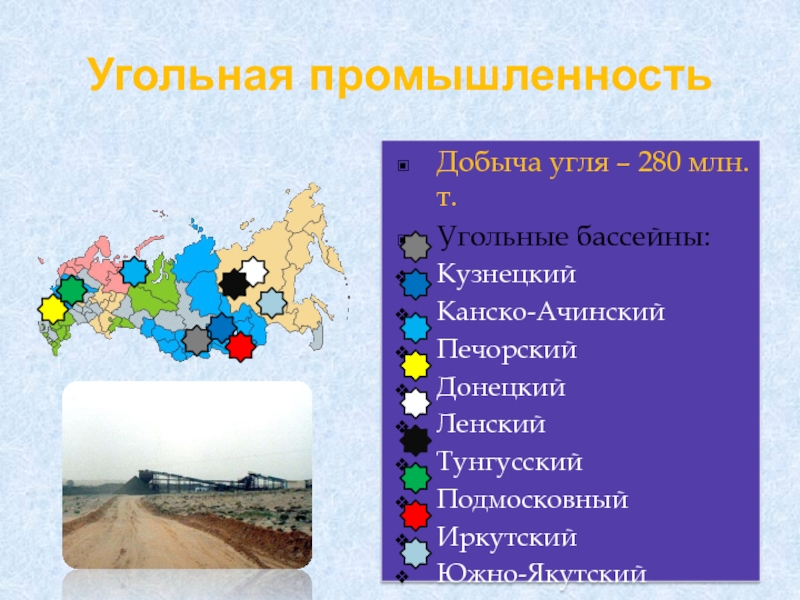 Угольная промышленностьДобыча угля – 280 млн.т.Угольные бассейны:КузнецкийКанско-АчинскийПечорскийДонецкийЛенский ТунгусскийПодмосковныйИркутскийЮжно-Якутский